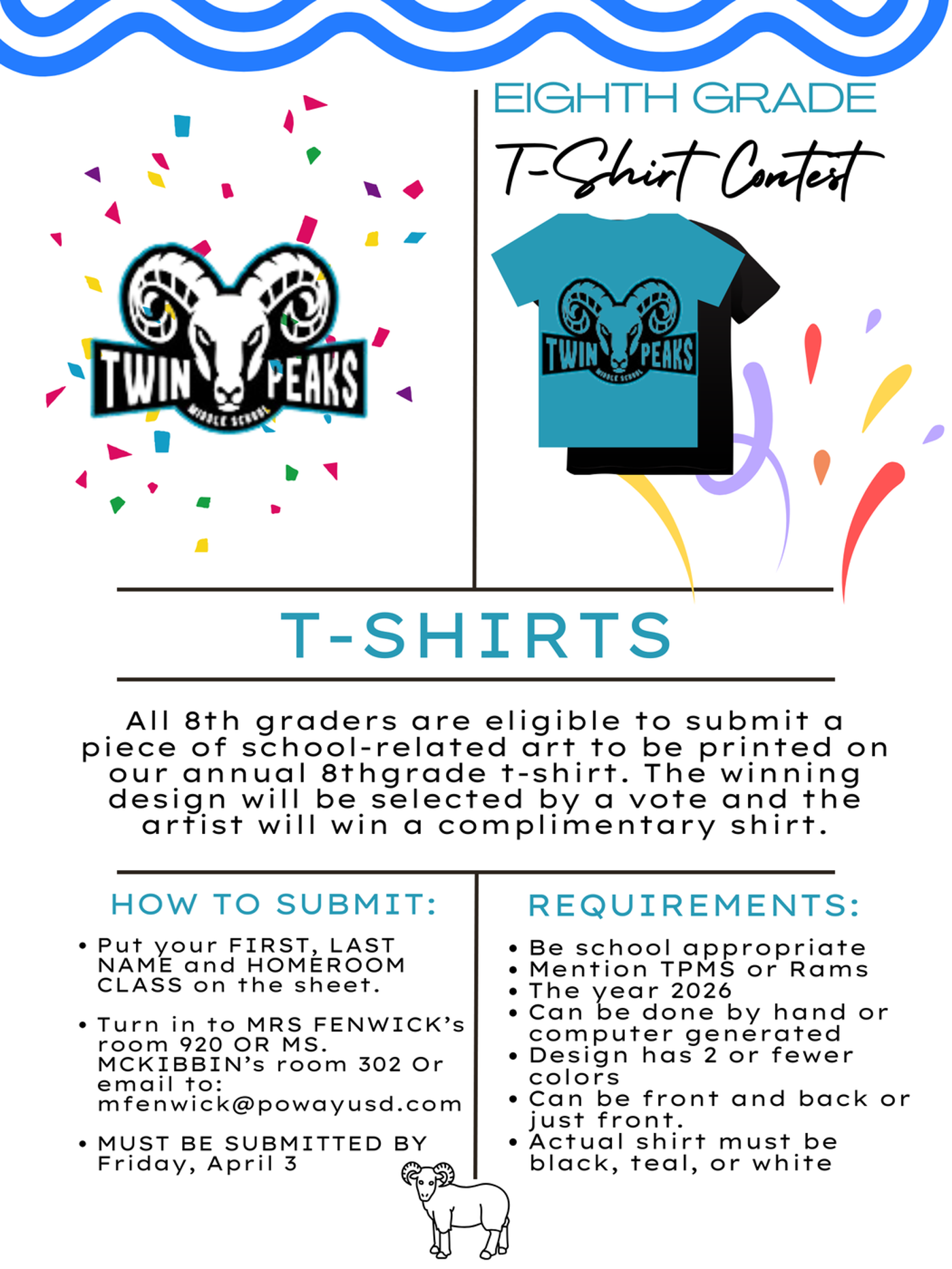 All 8th graders are eligible to submit a piece of school-related art to be printed on our annual 8th grade t-shirt. The winning design will be selected by a vote, and the artist will win a complimentary shirt. Click here for more details!
