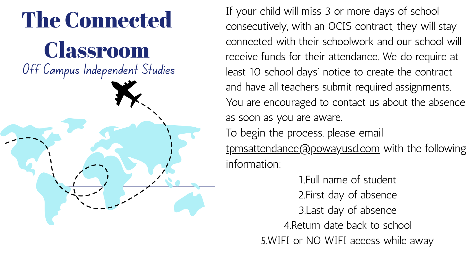 - If there is a planned extended absence, please see the Attendance Technician at least two weeks prior to the absence to set up a homework contract.
