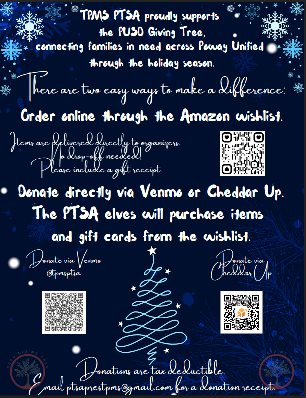 TPMS PTSA is proud to support the collaboration between the Palomar Council of PTAs and the PUSD Foundation in its annual Giving Tree program (formerly 'Adopt-a-Family'), connecting families in need across Poway Unified and bringing holiday joy to those who need it most. The Giving Tree is now in its third decade of supporting PUSD families. Because of your kindness and generosity, over 400 families received much-needed clothes, shoes, school supplies, household items, books, and toys in 2024.