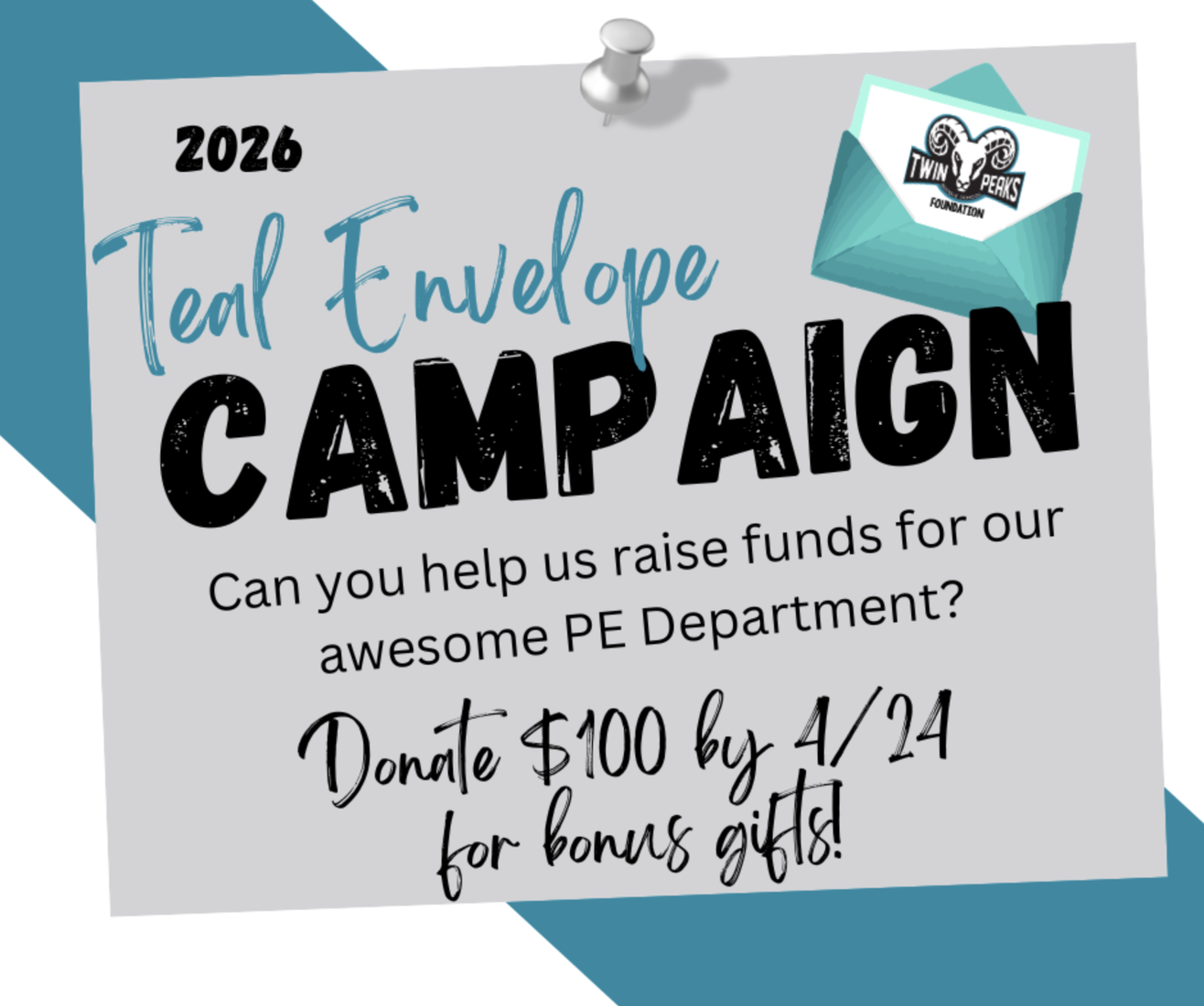 We invite Twin Peaks families to contribute $100 to support these improvements through our Teal Envelope Campaign. If we surpass our goal, we are excited about installing a Gaga Ball Court on campus! That's right, the most popular game from 6th grade camp will be here at TPMS - ask your students all about it!