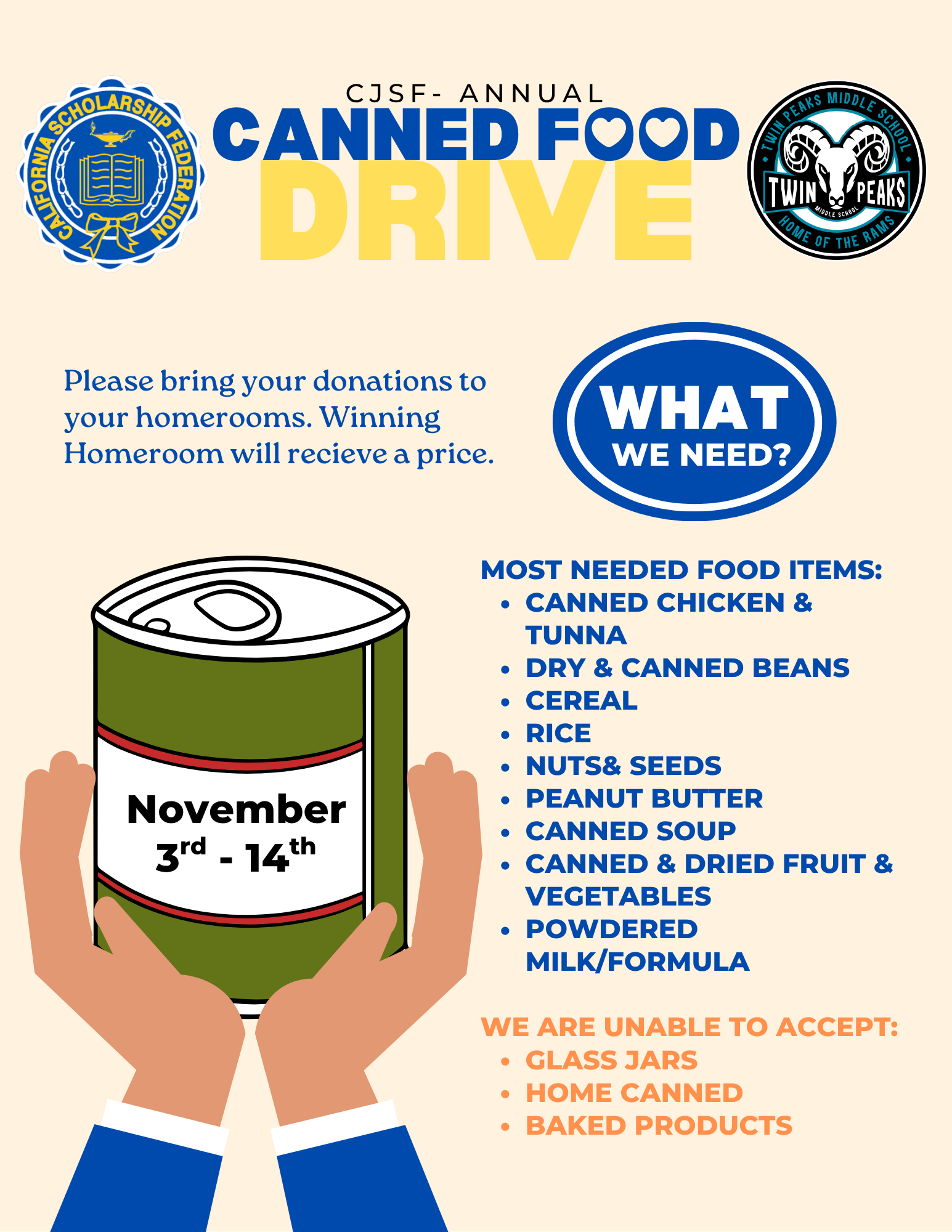 It’s the time for our yearly homeroom canned food drive competition! The CJSF club on campus has teamed up with the San Diego Food bank and we are currently conducting a food drive on our campus! It is a perfect time to ask your families to clean out those pantries at home! While we know you want to participate to help feed families around San Diego, your homeroom class has a chance to win a whole class prize! Double points for delicious and nutritious items like tuna, canned veggies, canned soup, and canned beans. We will see you out at the Science Patio - first and second lunch until November 14th!